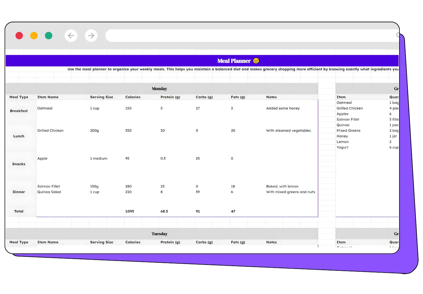 As someone with a busy schedule, this spreadsheet has been a lifesaver. It helps me plan my meals, stay on top of my calorie intake, and track my workouts effortlessly. Plus, the habit tracker keeps me accountable and ensures I stay consistent with my routine.